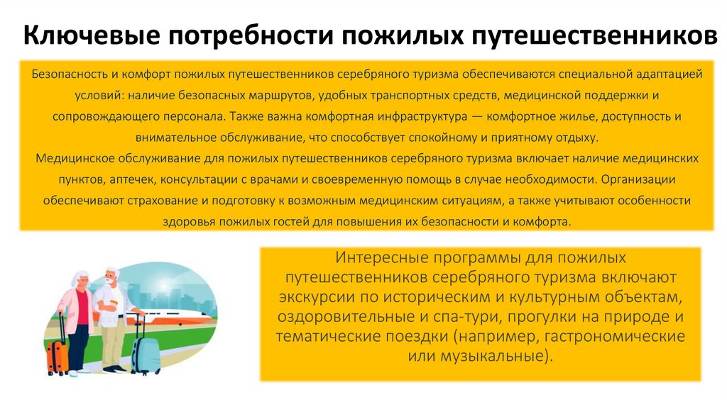 Ключевые потребности пожилых путешественниковБезопасность и комфорт пожилых путешественников серебряного туризма обеспечиваются специальной адаптацией