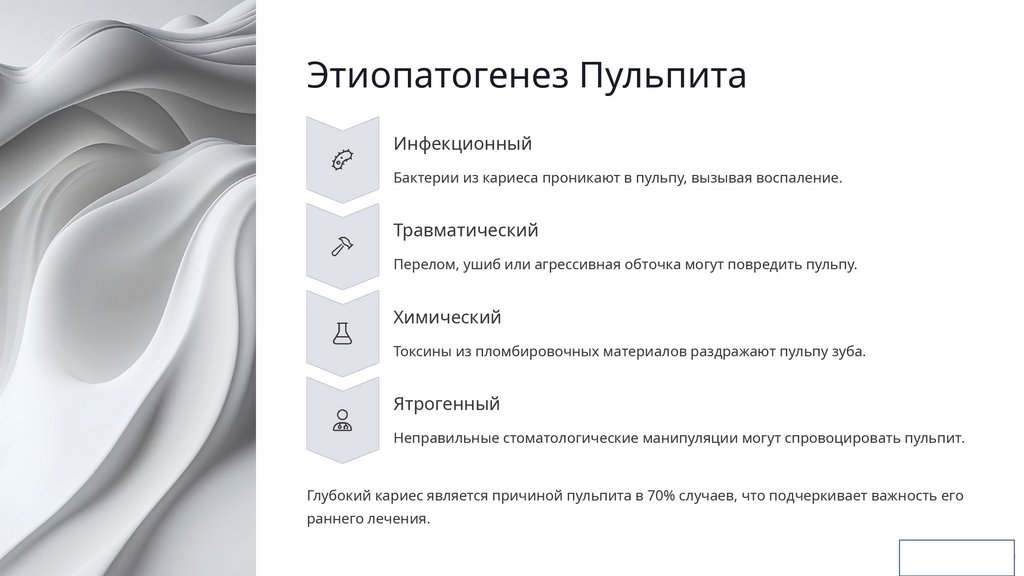 Глубокий кариес является причиной пульпита в 70% случаев, что подчеркивает важность его