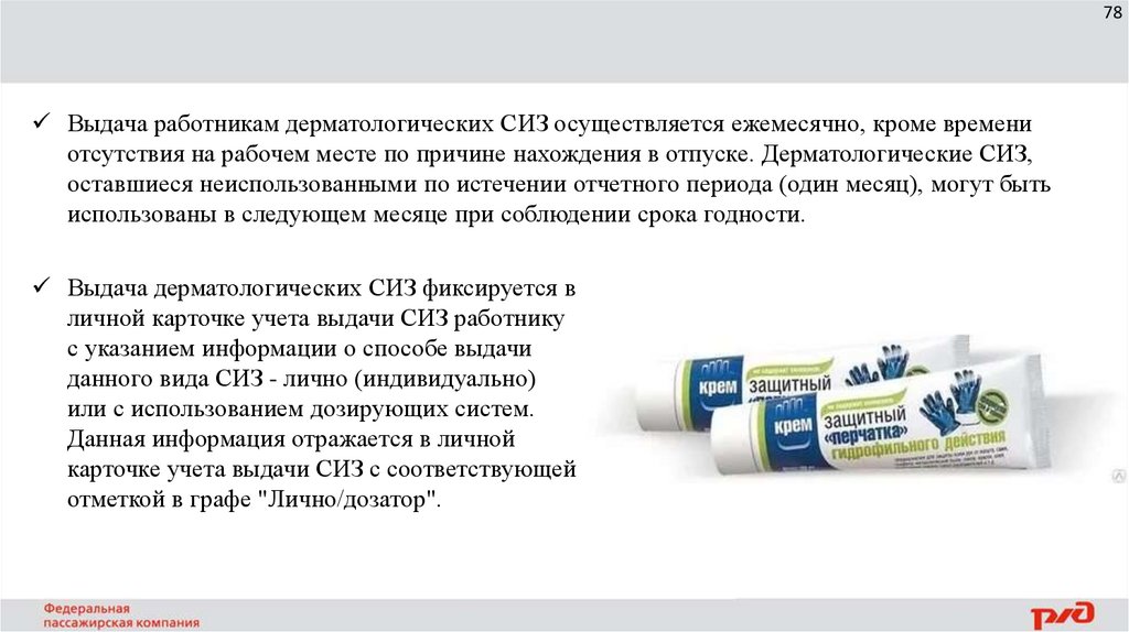78Выдача работникам дерматологических СИЗ осуществляется ежемесячно, кроме времени