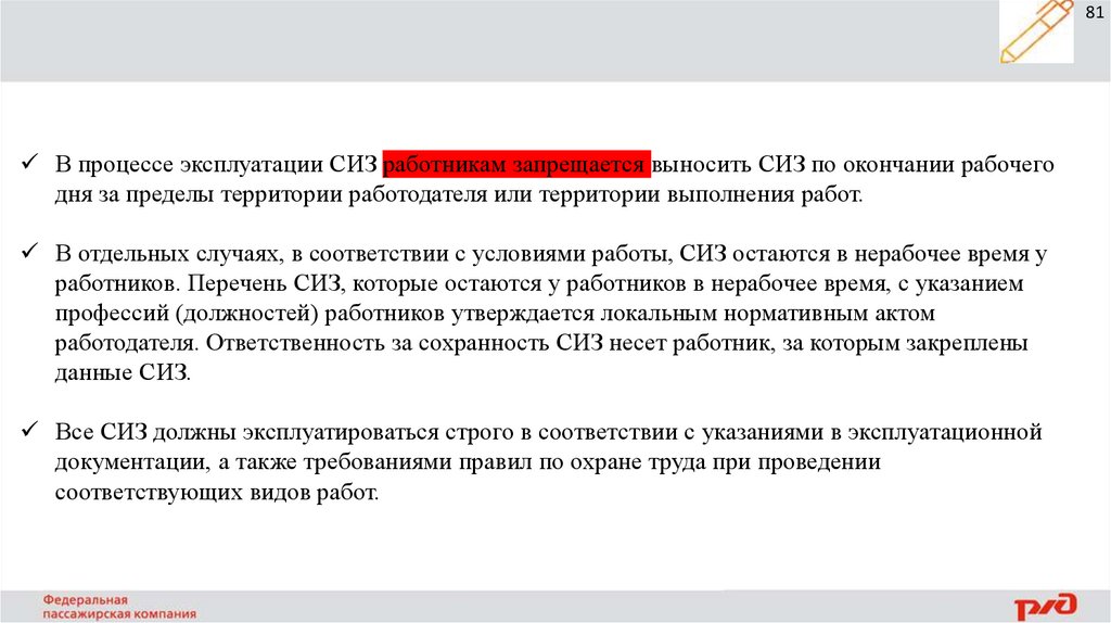 81В процессе эксплуатации СИЗ работникам запрещается выносить СИЗ по окончании рабочего