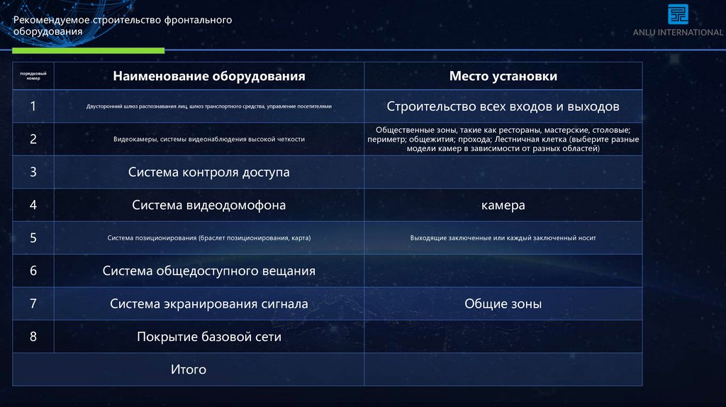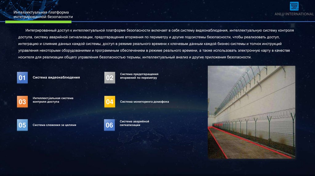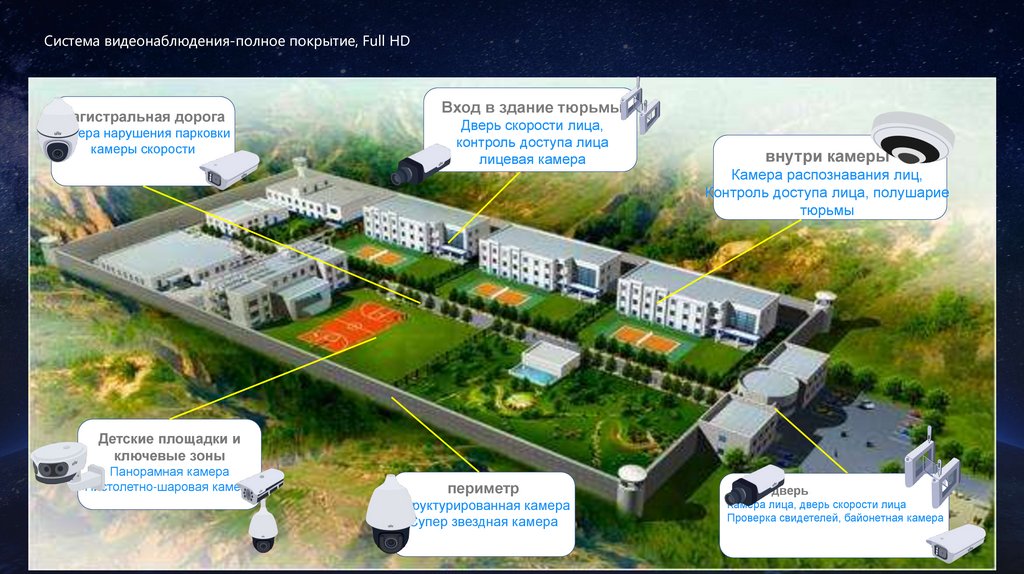 Система видеонаблюдения, система контроля доступа, система периметра, система экранирования сигнала и т.д.