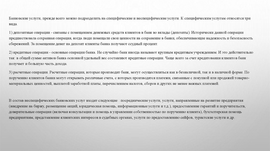 Банковские услуги, прежде всего можно подразделить на специфические и неспецифические услуги. К специфическим услугам относятся тривида.
