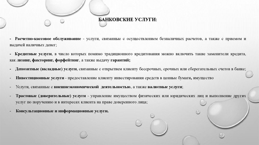 БАНКОВСКИЕ УСЛУГИ:- Расчетно-кассовое обслуживание - услуги, связанные с осуществлением безналичных расчетов, а также с приемом и
