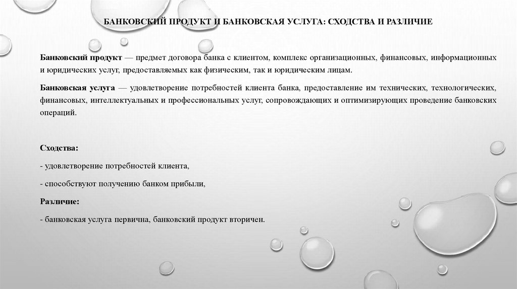 БАНКОВСКИЙ ПРОДУКТ И БАНКОВСКАЯ УСЛУГА: СХОДСТВА И РАЗЛИЧИЕБанковский продукт — предмет договора банка с клиентом, комплекс организационных, финансовых, информационных