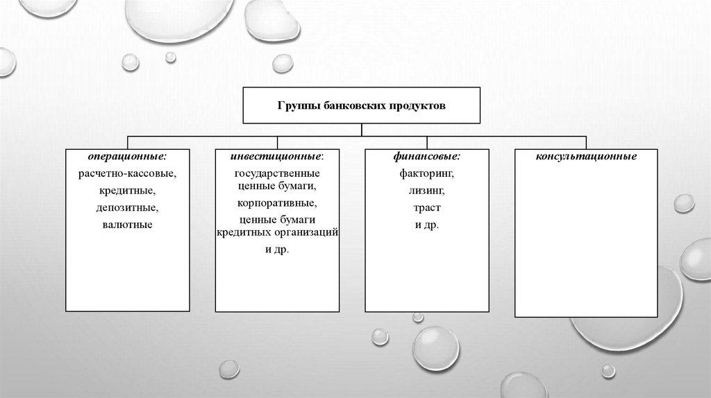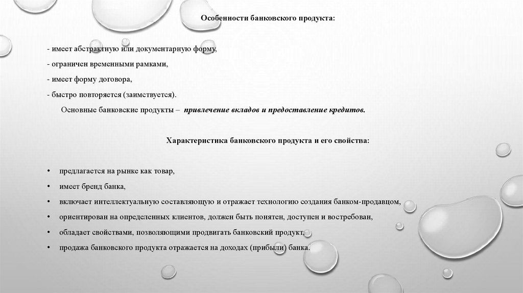 • Отличительной чертой банковского продукта является его нематериальный и денежный характер.