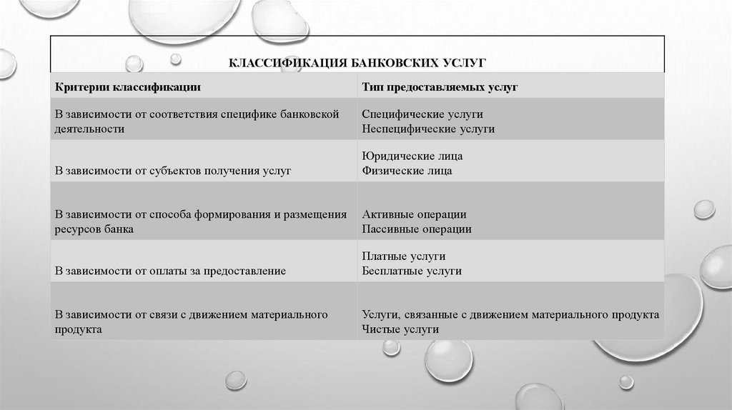 КЛАССИФИКАЦИЯ БАНКОВСКИХ УСЛУГКритерии классификации