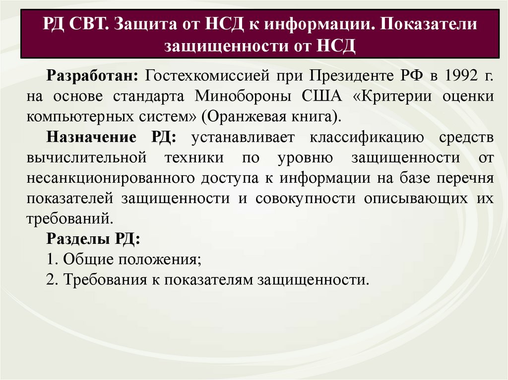 РД СВТ. Защита от НСД к информации. Показателизащищенности от НСД