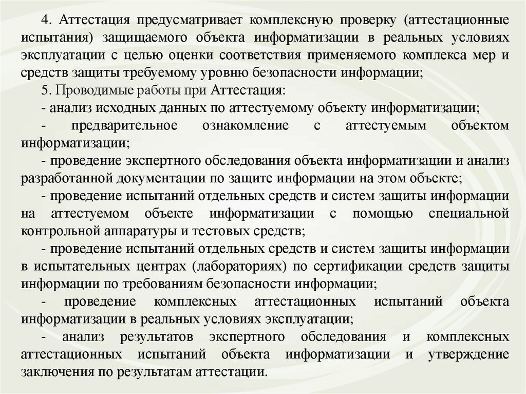 4. Аттестация предусматривает комплексную проверку (аттестационныеиспытания) защищаемого объекта информатизации в реальных условиях