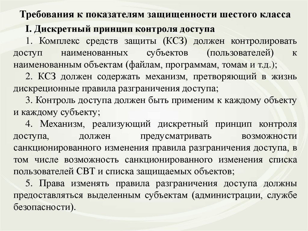 Требования к показателям защищенности шестого классаI. Дискретный принцип контроля доступа