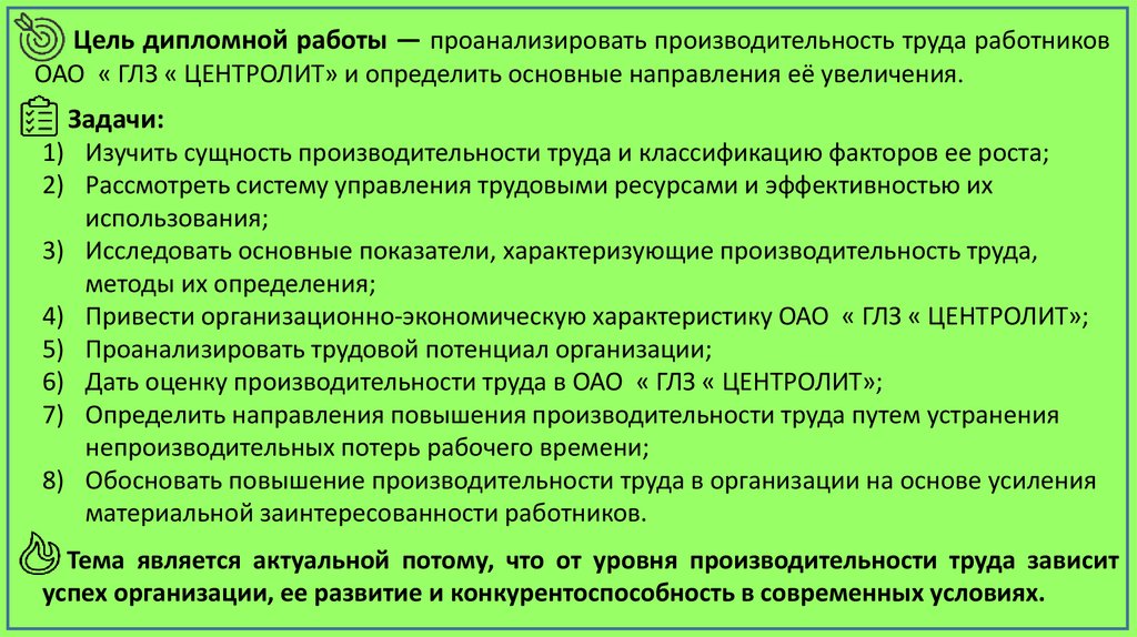 Цель дипломной работы — проанализировать производительность труда работниковОАО « ГЛЗ « ЦЕНТРОЛИТ» и определить основные направления её увеличения.