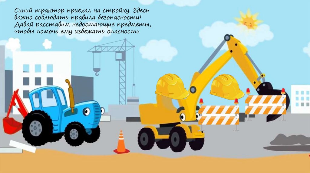 Синий трактор приехал на стройку. Здесьважно соблюдать правила безопасности!