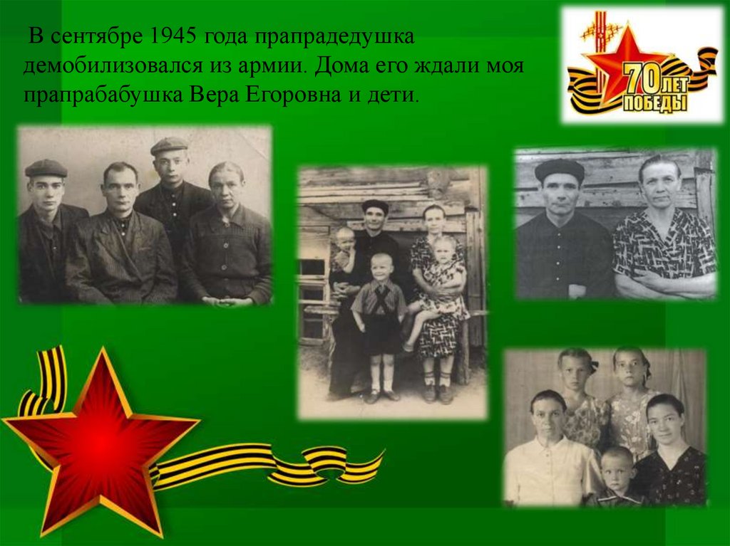 В сентябре 1945 года прапрадедушкадемобилизовался из армии. Дома его ждали моя
