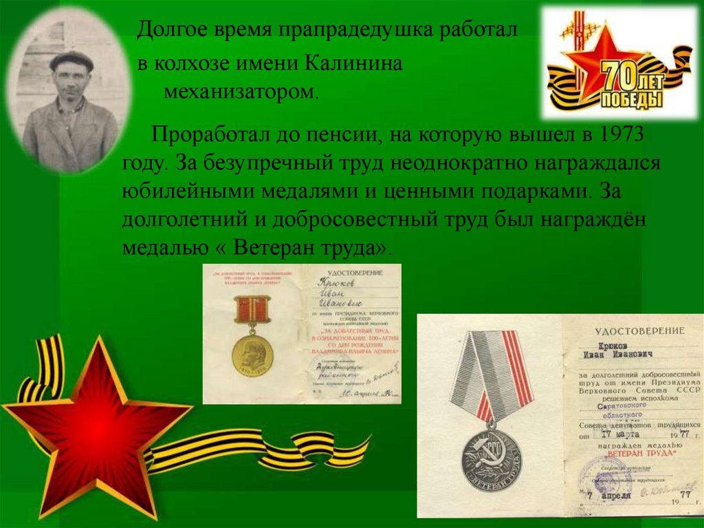 Долгое время прапрадедушка работалв колхозе имени Калинина