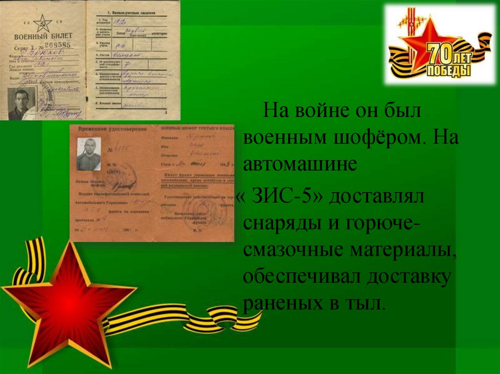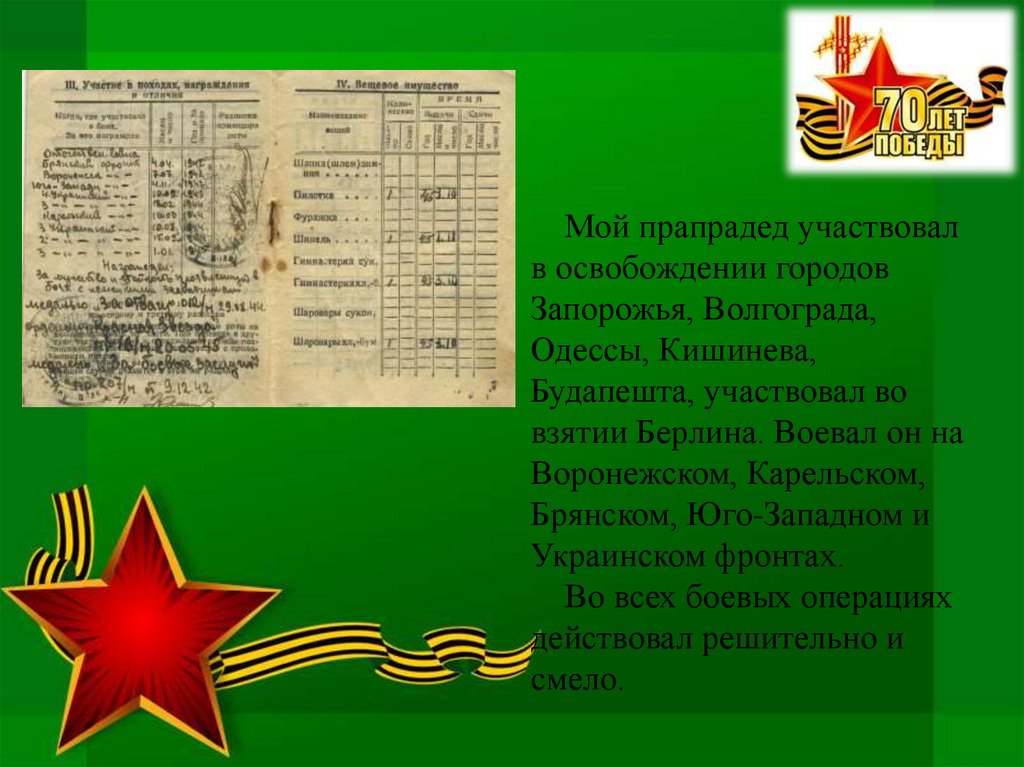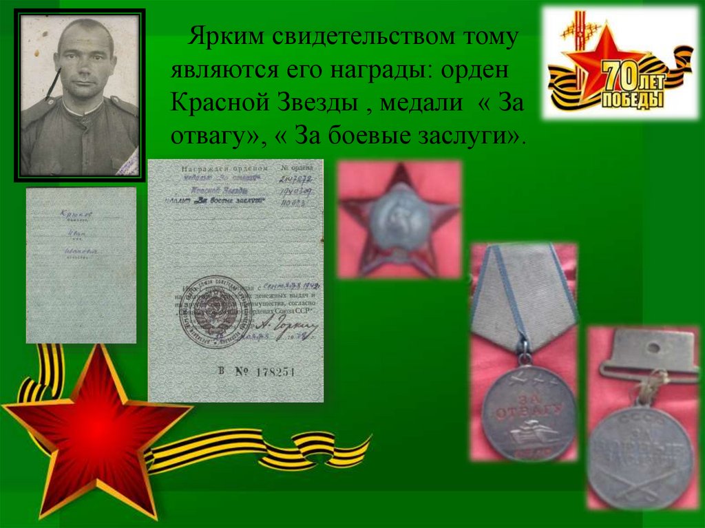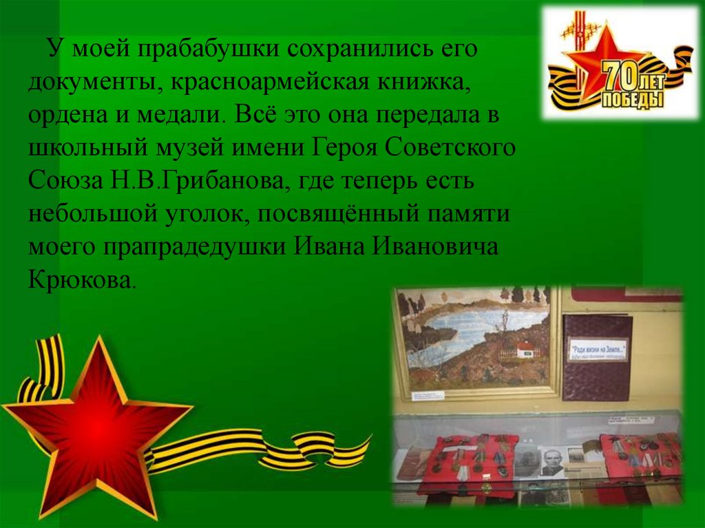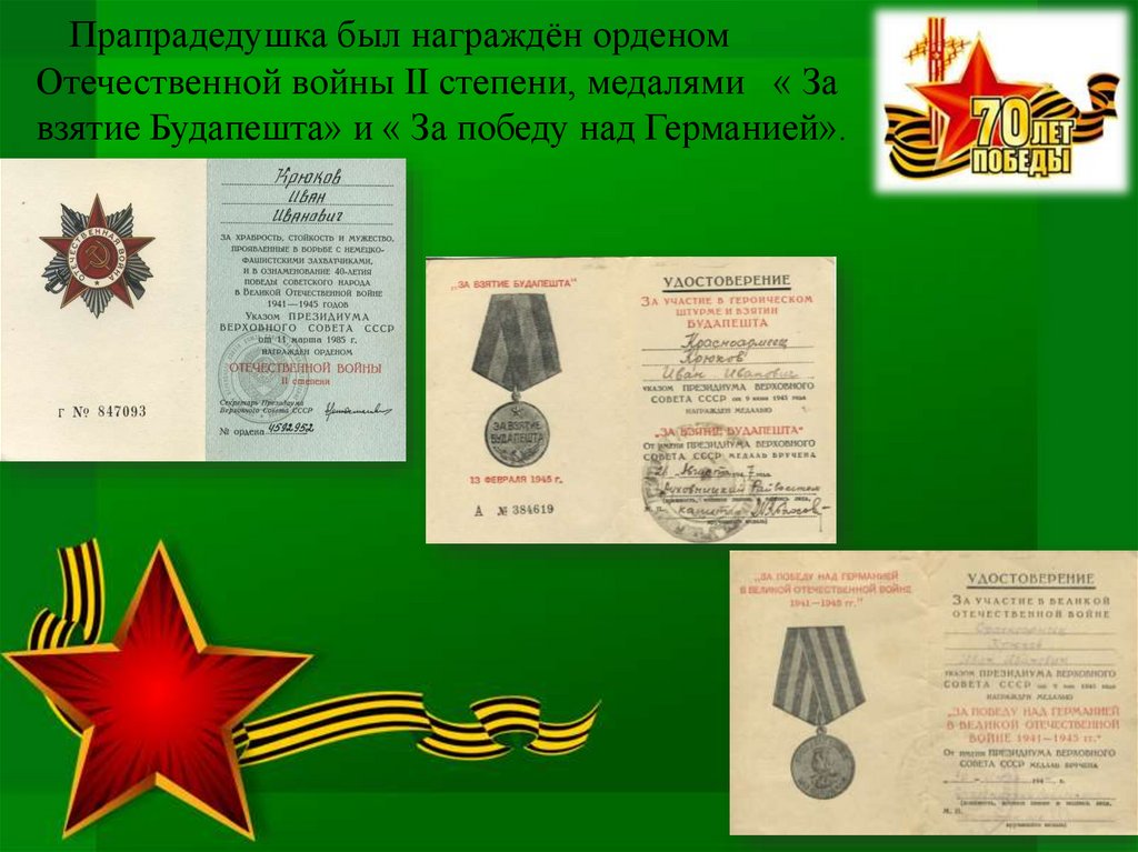 Прапрадедушка был награждён орденомОтечественной войны II степени, медалями « За