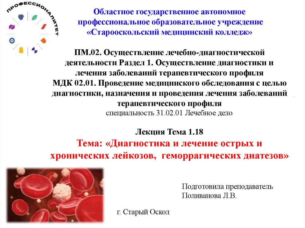 Диагностика и лечение острых и хронических лейкозов, геморрагических диатезов