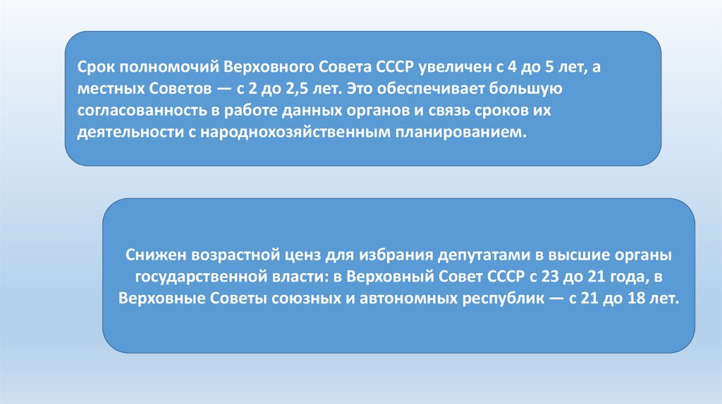Срок полномочий Верховного Совета СССР увеличен с 4 до 5 лет, аместных Советов — с 2 до 2,5 лет. Это обеспечивает большую