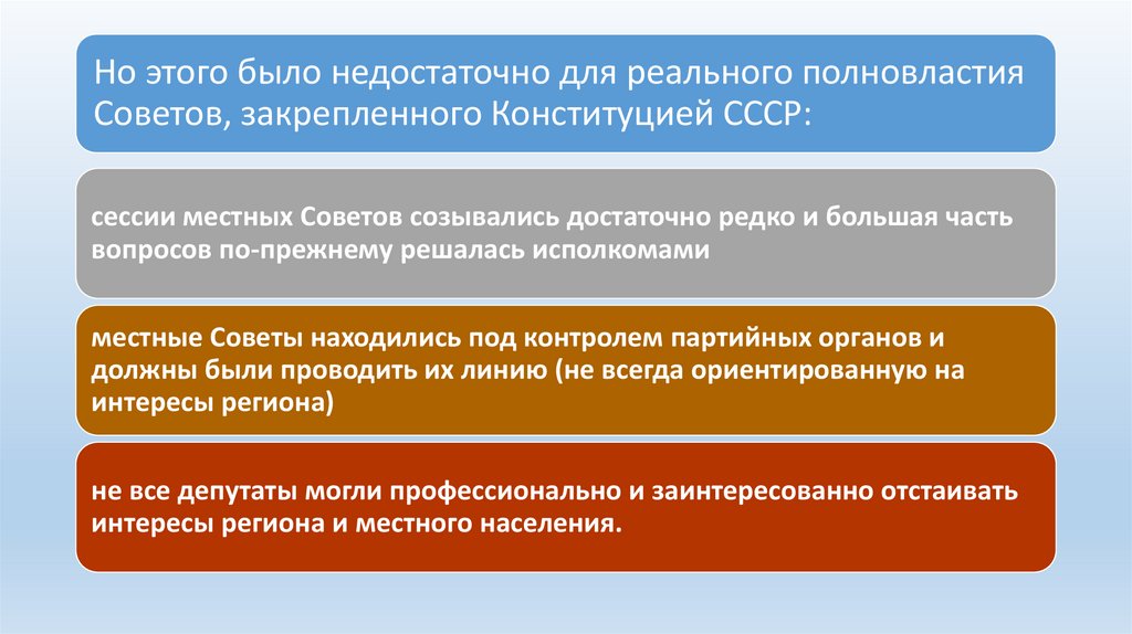 Но этого было недостаточно для реального полновластияСоветов, закрепленного Конституцией СССР: