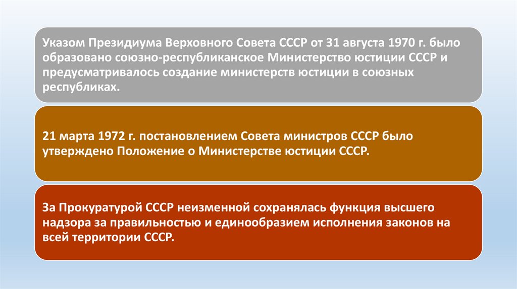 Указом Президиума Верховного Совета СССР от 31 августа 1970 г. былообразовано союзно-республиканское Министерство юстиции СССР и