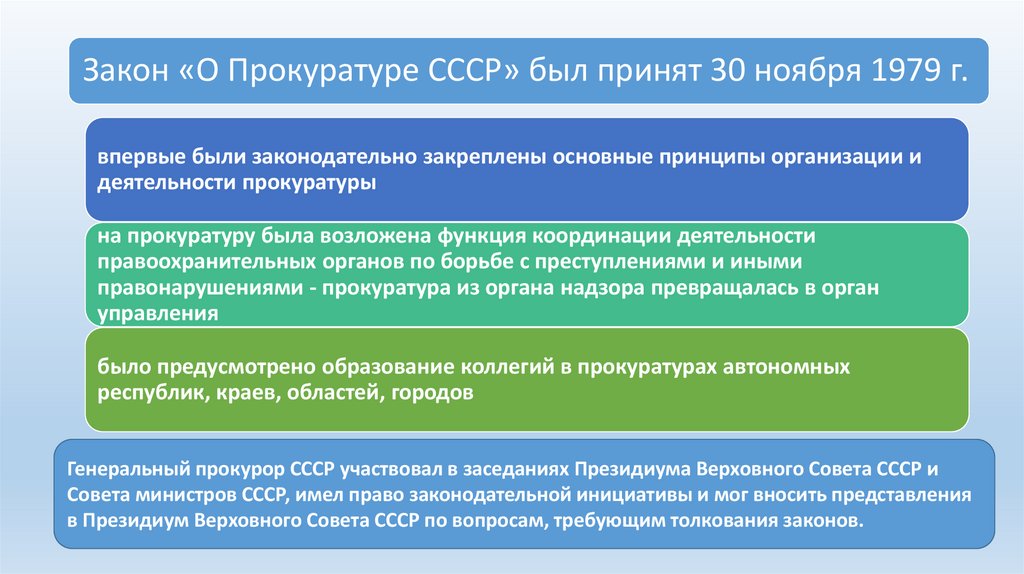 Закон «О Прокуратуре СССР» был принят 30 ноября 1979 г.впервые были законодательно закреплены основные принципы организации и