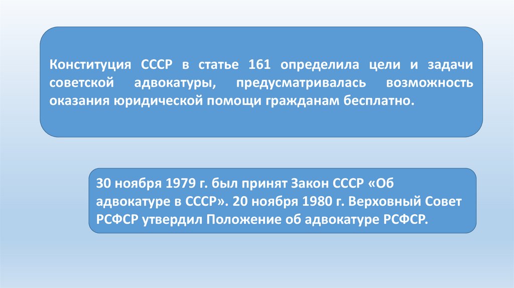 Конституция СССР в статье 161 определила цели и задачисоветской адвокатуры, предусматривалась возможность