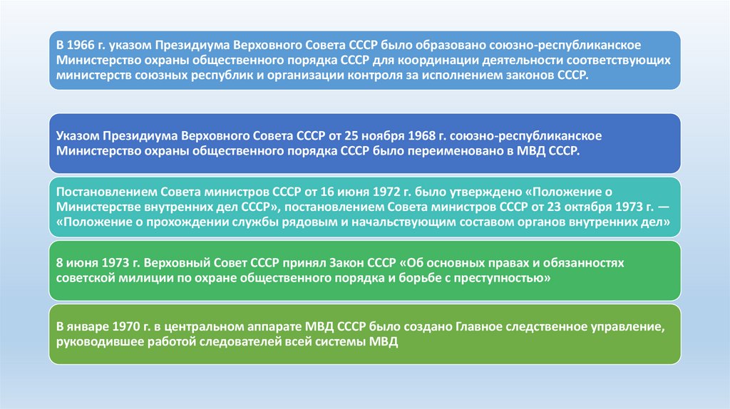 В 1966 г. указом Президиума Верховного Совета СССР было образовано союзно-республиканскоеМинистерство охраны общественного порядка СССР для координации деятельности соответствующих