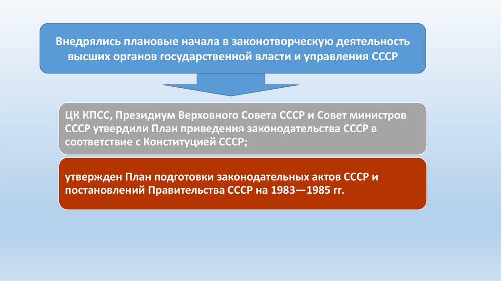 Внедрялись плановые начала в законотворческую деятельностьвысших органов государственной власти и управления СССР