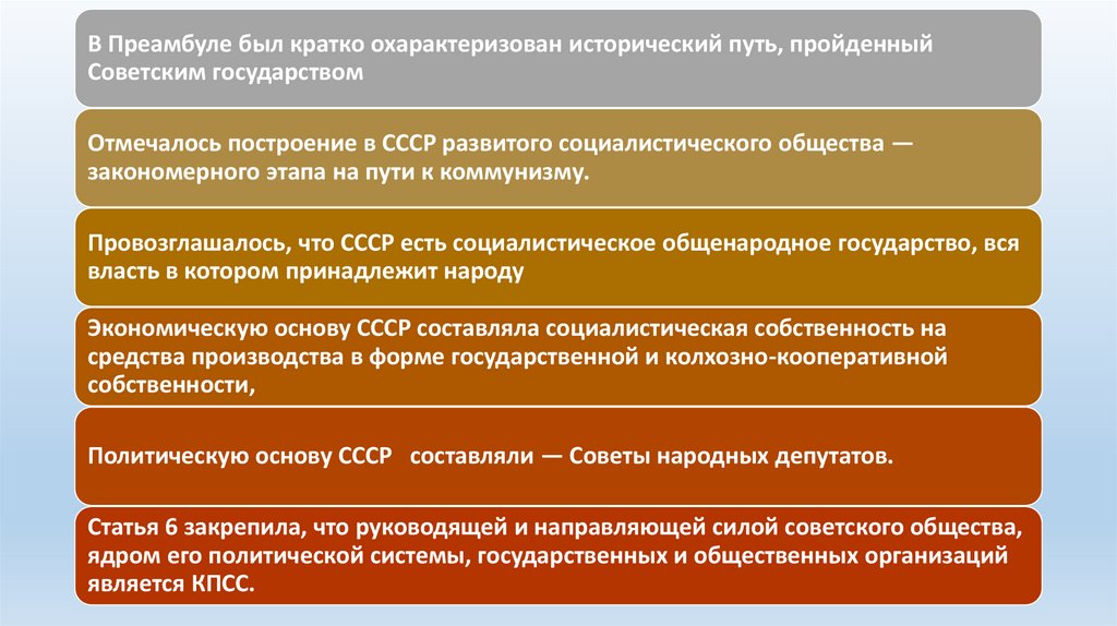 В Преамбуле был кратко охарактеризован исторический путь, пройденныйСоветским государством