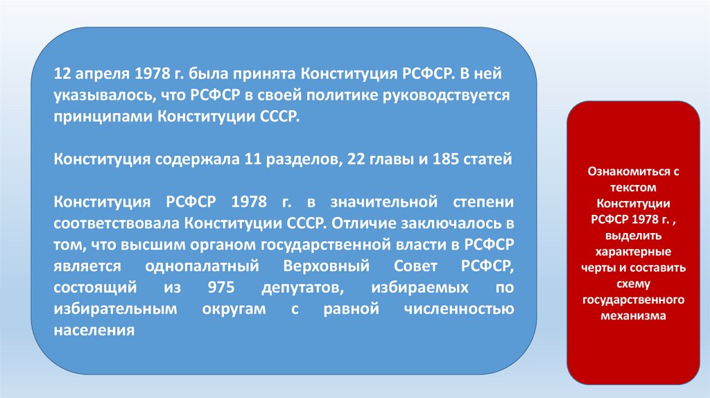 12 апреля 1978 г. была принята Конституция РСФСР. В нейуказывалось, что РСФСР в своей политике руководствуется