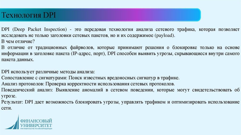информации в заголовке пакета (IP-адрес, порт), DPI способен выявить угрозы, скрывающиеся внутри самого