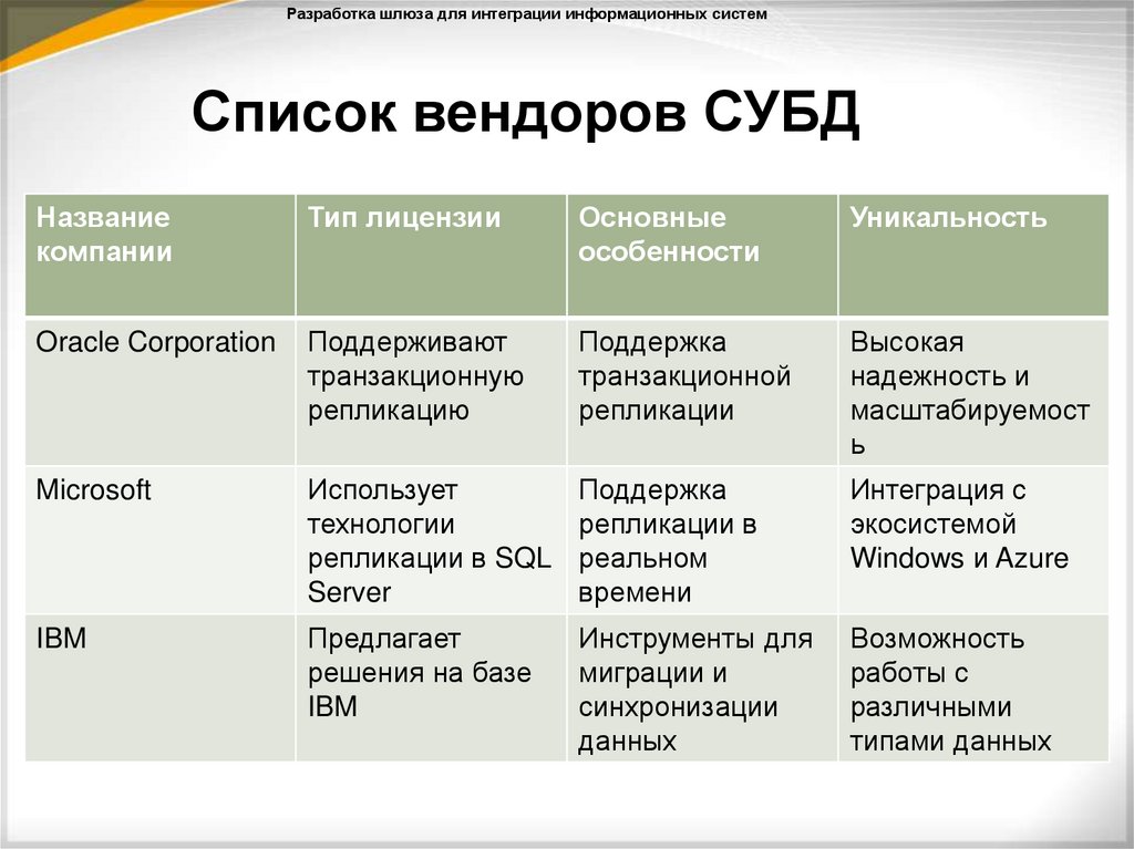 Разработка шлюза для интеграции информационных системСписок вендоров СУБД
