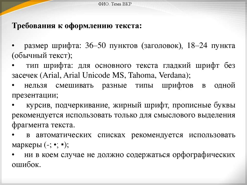 • размер шрифта: 36–50 пунктов (заголовок), 18–24 пункта