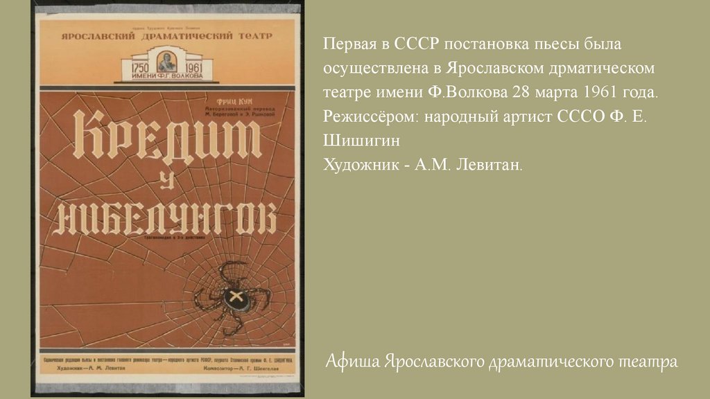 Первая в СССР постановка пьесы былаосуществлена в Ярославском дрматическом