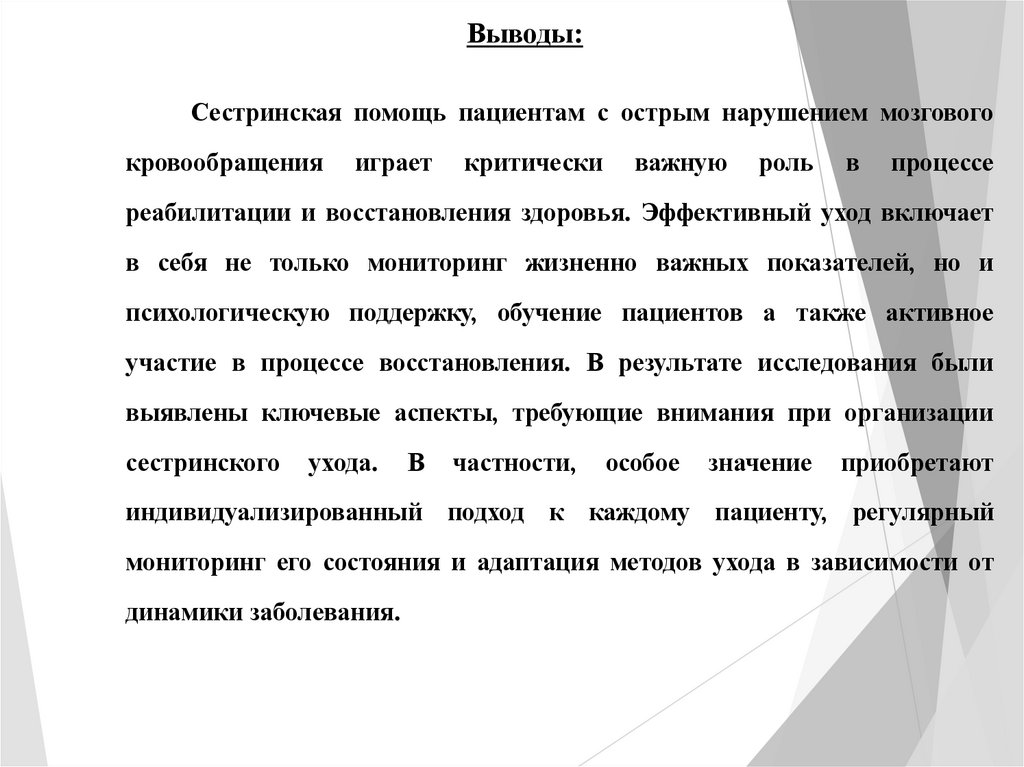Выводы:Сестринская помощь пациентам с острым нарушением мозгового