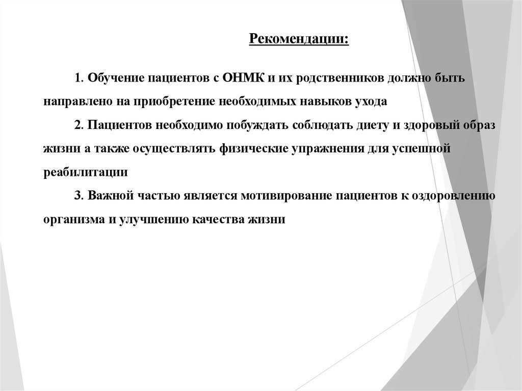 Рекомендации:1. Обучение пациентов с ОНМК и их родственников должно быть