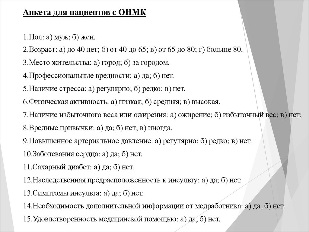 Анкета для пациентов с ОНМК1.Пол: а) муж; б) жен.
