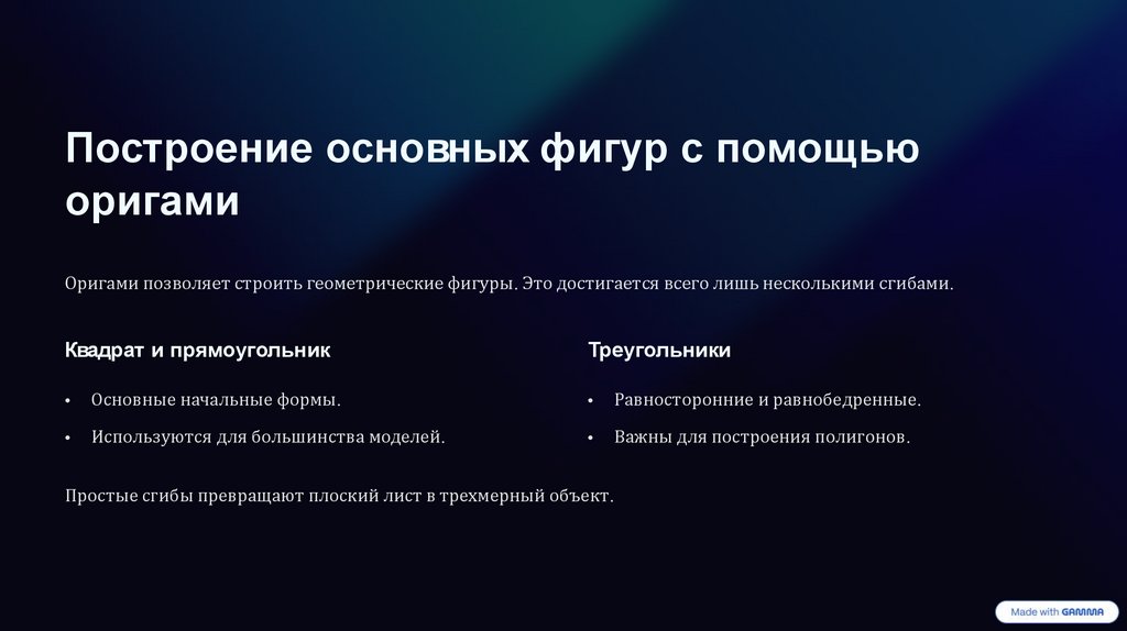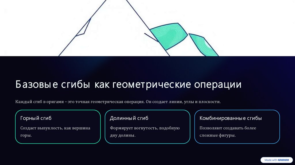 Б азовы е сгибы как геометрические операцииКаждый сгиб в оригами – это точная геометрическая операция. Он создает линии, углы и плоскости.