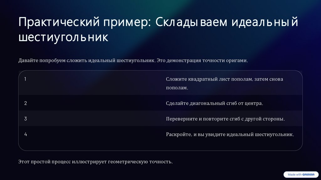 Давайте попробуем сложить идеальный шестиугольник. Это демонстрация точности оригами.