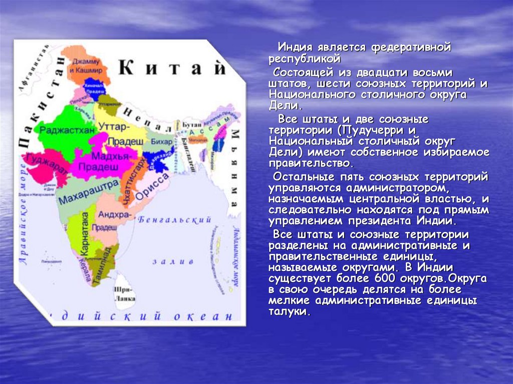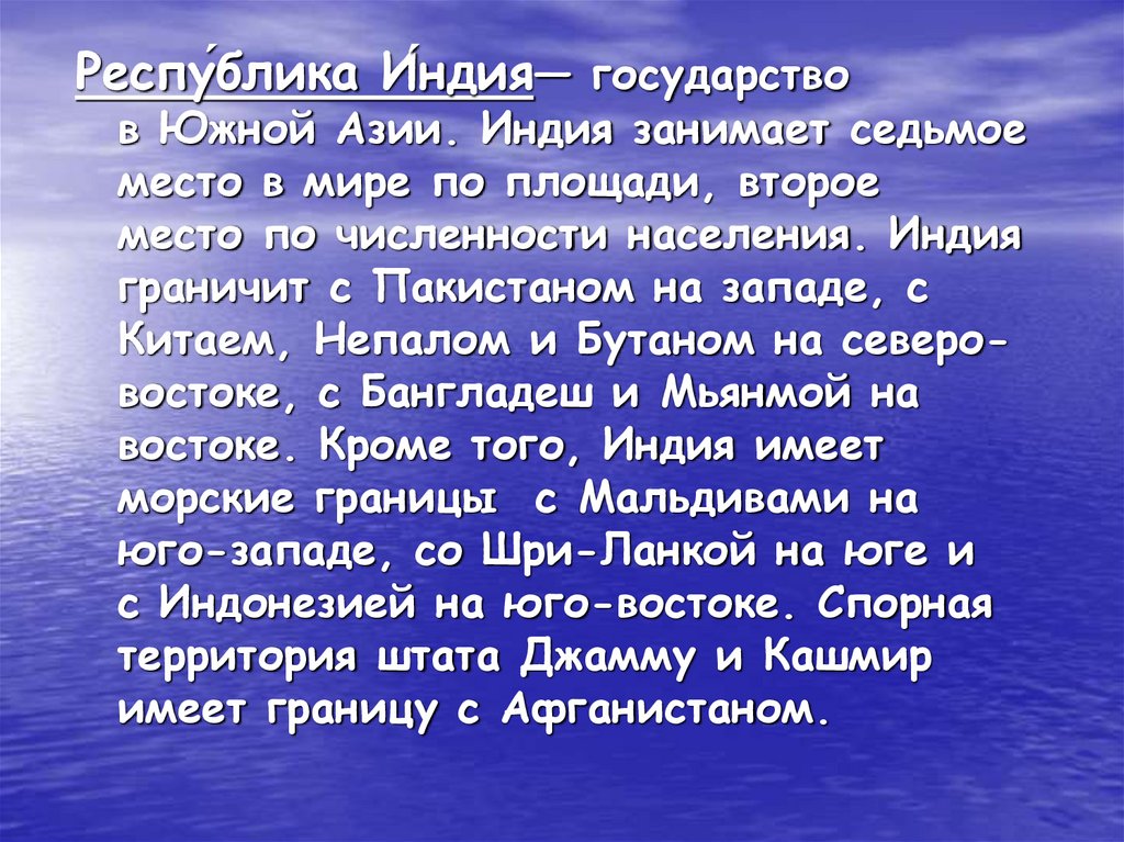 Респу́блика И́ндия— государствов Южной Азии. Индия занимает седьмое