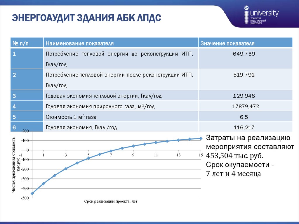 энергии составила 116,217 Гкал. Срок окупаемости составил 7 лет и 4 месяца.
