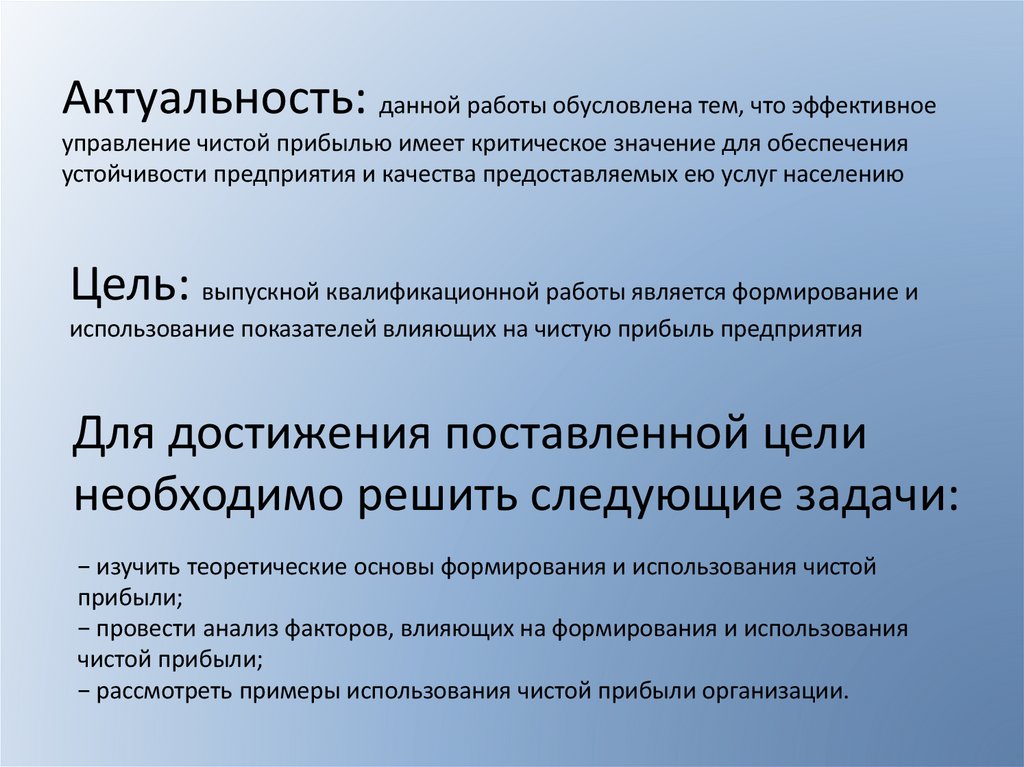 Актуальность: данной работы обусловлена тем, что эффективноеуправление чистой прибылью имеет критическое значение для обеспечения