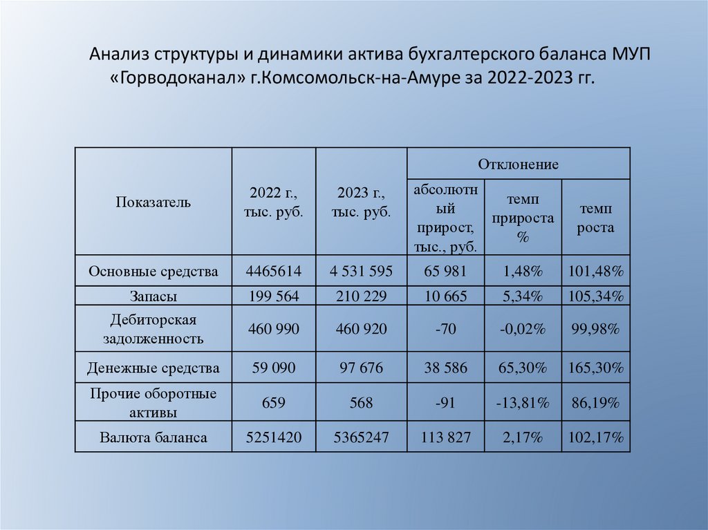 Анализ структуры и динамики актива бухгалтерского баланса МУП«Горводоканал» г.Комсомольск-на-Амуре за 2022-2023 гг.