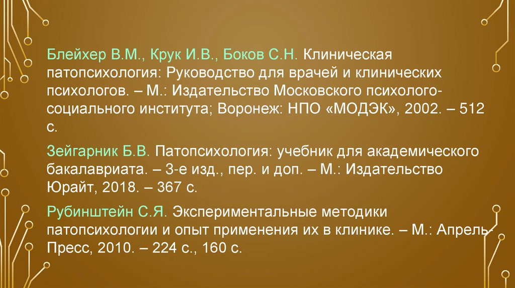 Левченко И.Ю. Патопсихология: Теория и практика. – М.: Издательский центр «Академия»,