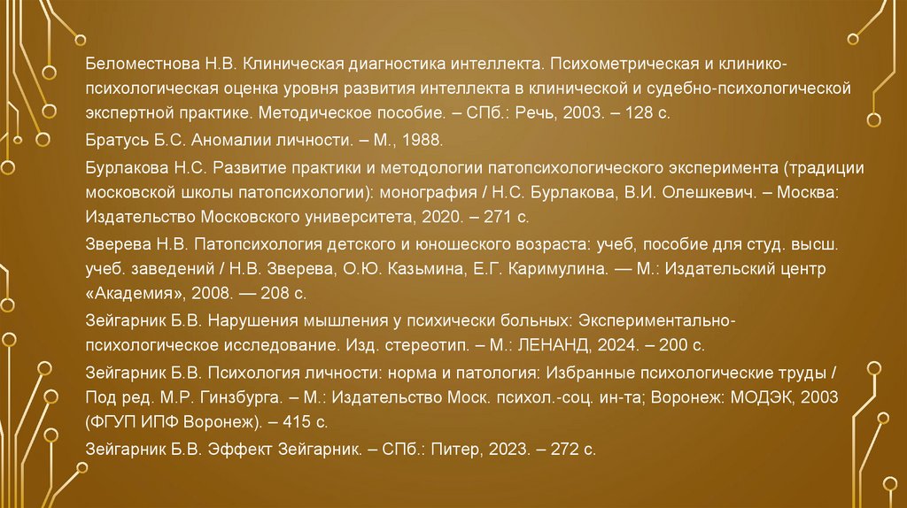 Беломестнова Н.В. Клиническая диагностика интеллекта. Психометрическая и клиникопсихологическая оценка уровня развития интеллекта в клинической и судебно-психологическойэкспертной практике. Методическое пособие. – СПб.: Речь, 2003. – 128 с.