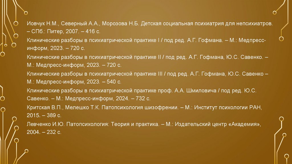 Иовчук Н.М., Северный А.А., Морозова Н.Б. Детская социальная психиатрия для непсихиатров.– СПб.: Питер, 2007. – 416 с.