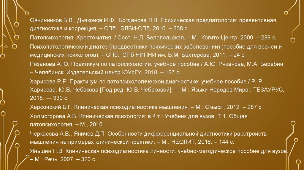 Овчинников Б.В., Дьяконов И.Ф., Богданова Л.В. Психическая предпатология: превентивнаядиагностика и коррекция. – СПб.: ЭЛБИ-СПб, 2010. – 368 с.