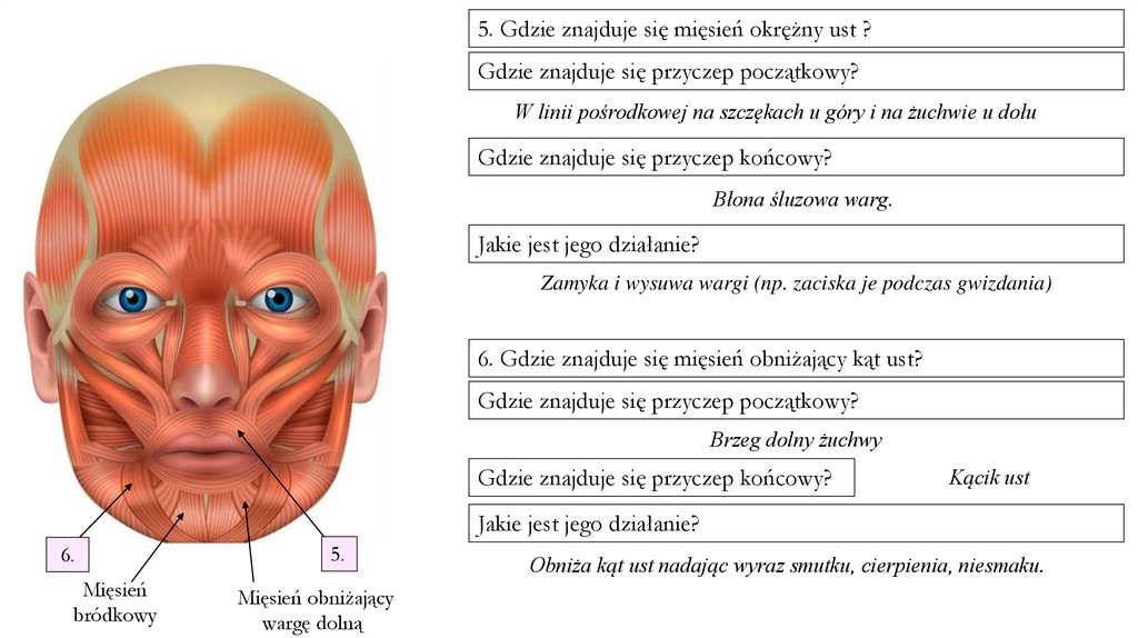 5. Gdzie znajduje się mięsień okrężny ust ?Gdzie znajduje się przyczep początkowy?