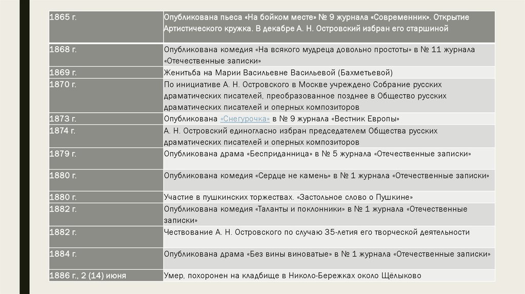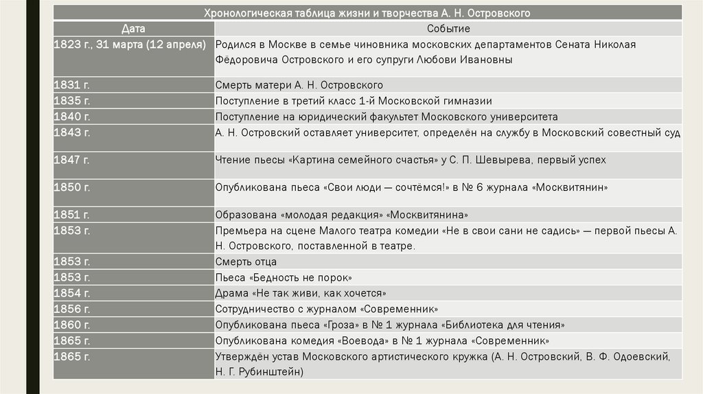 Хронологическая таблица жизни и творчества А. Н. ОстровскогоДата