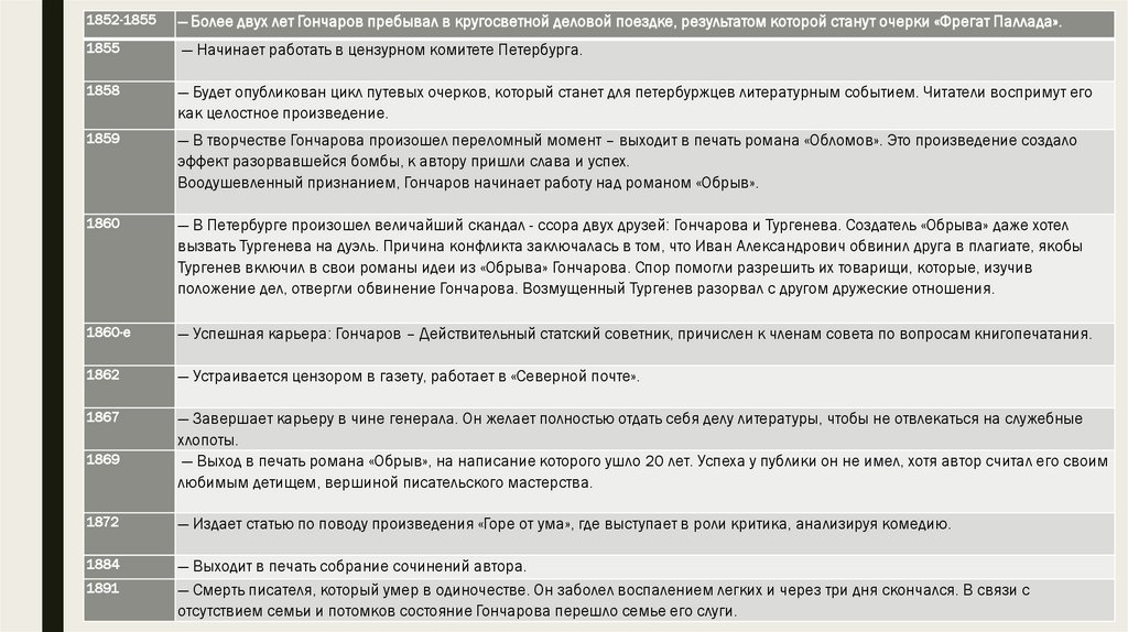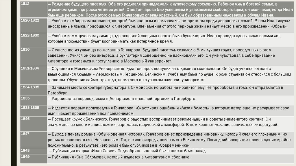 — Посещает кружок Белинского. Гончаров с радостью воспринимает рекомендации и советы знаменитого критика. Он