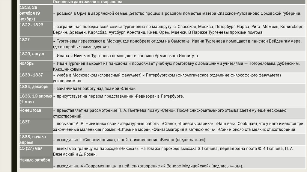 – Иван Тургенев выходит из пансиона и продолжает учебную подготовку с домашними учителями — Погореловым, Дубенским,