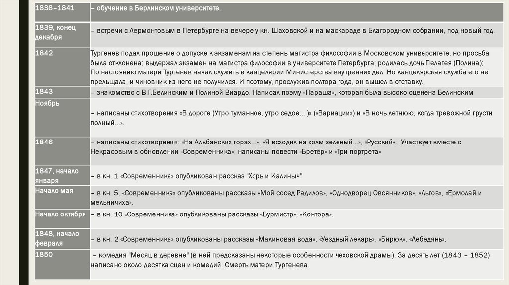 – знакомство с В.Г.Белинским и Полиной Виардо. Написал поэму «Параша», которая была высоко оценена Белинским